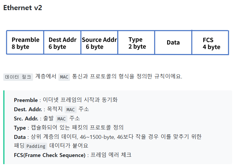 위와 같이 전송하는 데이터를 구조로 되어있을 때, 이 주소들을 정의하는 것이 데이터 링크 계층이라고 볼 수 있는 것 같다. 예를 들어 위 사진의 Ethernet v2 라는 것 자체가 데이터 링크 계층에 사용되는 프로토콜로, 저렇게 보내겠다고 정의한 것이라고 이해하였다.