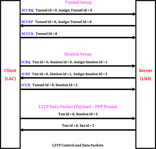 L2TP를 예시로 보면 다음과 같은 패킷 교환이 이루어진다.