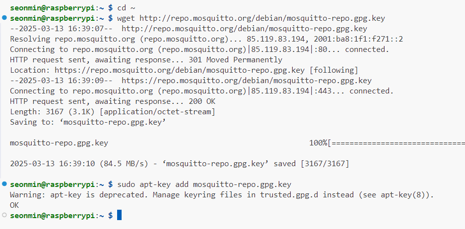 서명 키 받기 - 오픈 소스인 Mosquitto 활용을 할 예정이기에, 그리고 Debian OS에서 작동시킬 예정이기에 블로그에서 소개한 방식대로 wget을 사용한 다운로드를 진행해야 한다고 한다.